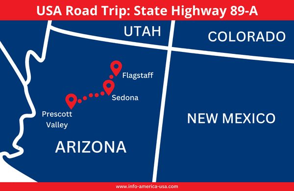 State Highway 89-A runs North-South through Arizona, connecting the cities of Prescott and Sedona. Your road trip will take you to some of the state's most scenic areas, such as Prescott National Forest and Coconino National Forest, and provide access to popular outdoor recreation areas like Oak Creek Canyon and Red Rock Country.